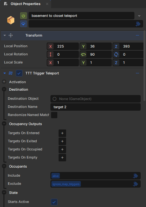 Teleports are very simple. Create an empty GameObject and add a TTT Trigger Teleport component. It will add the component and a collider onto the GameObject.